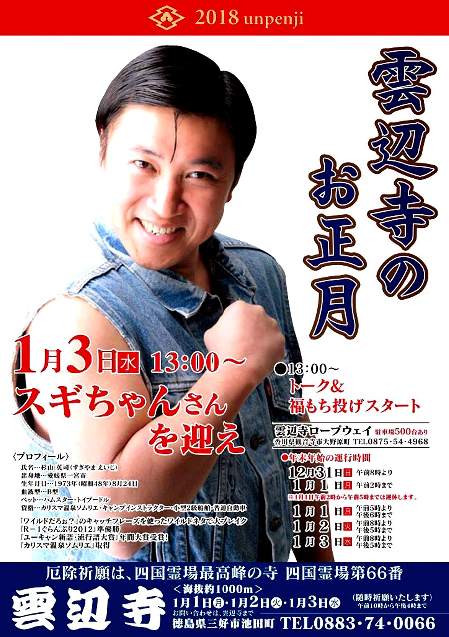 お正月恒例 雲辺寺 福餅投げ。 スギちゃん さん トークショー&福もち投げ に