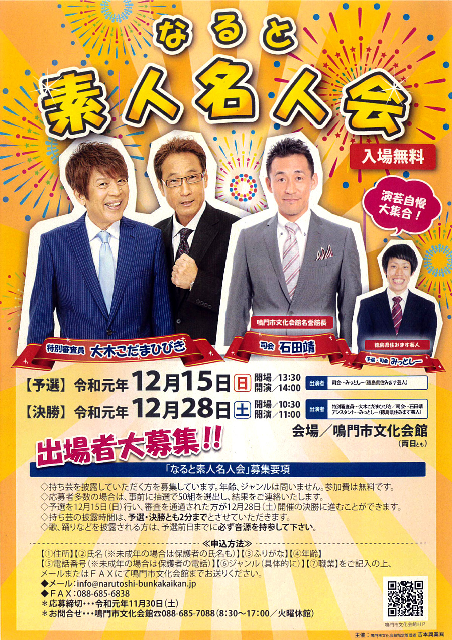 徳島県鳴門市撫養町 鳴門市文化会館 にて、 なると素人名人会 が 開催されます。