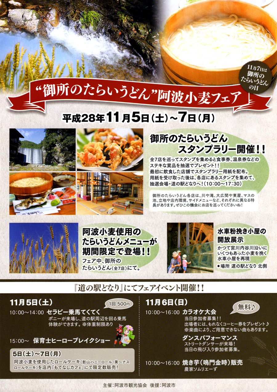 阿波小麦フェア を 開催します。 11月7日 は 御所のたらいうどんの日。