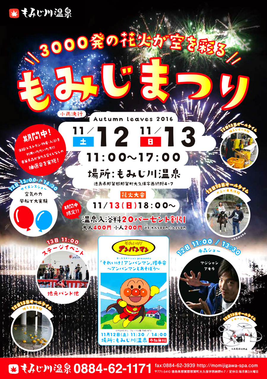 詳細は、 もみじ川温泉 HP情報 なども、ご参考にして、お出かけ下さい。