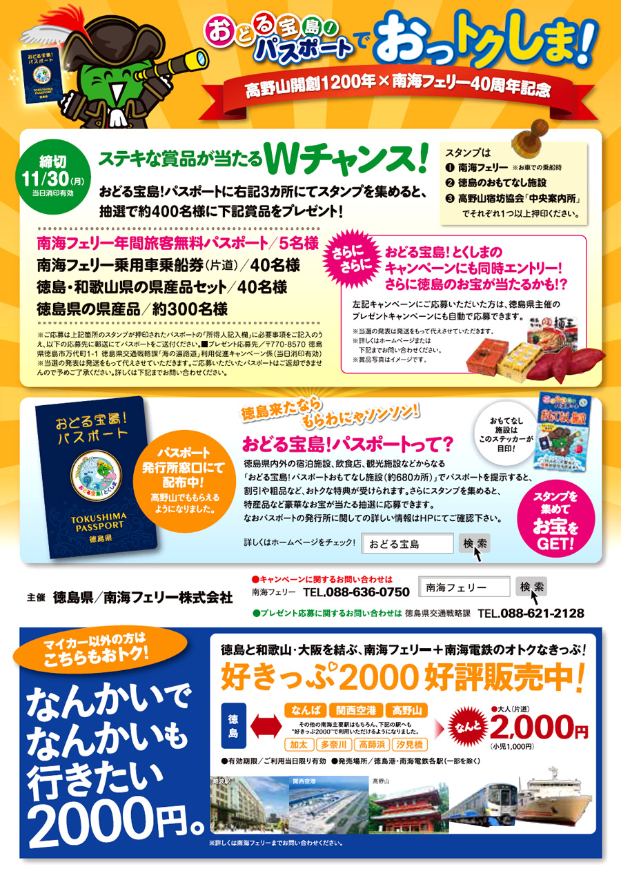 徳島県 おどる宝島!パスポートを持って、南海フェリー に マイカー乗船した方に
