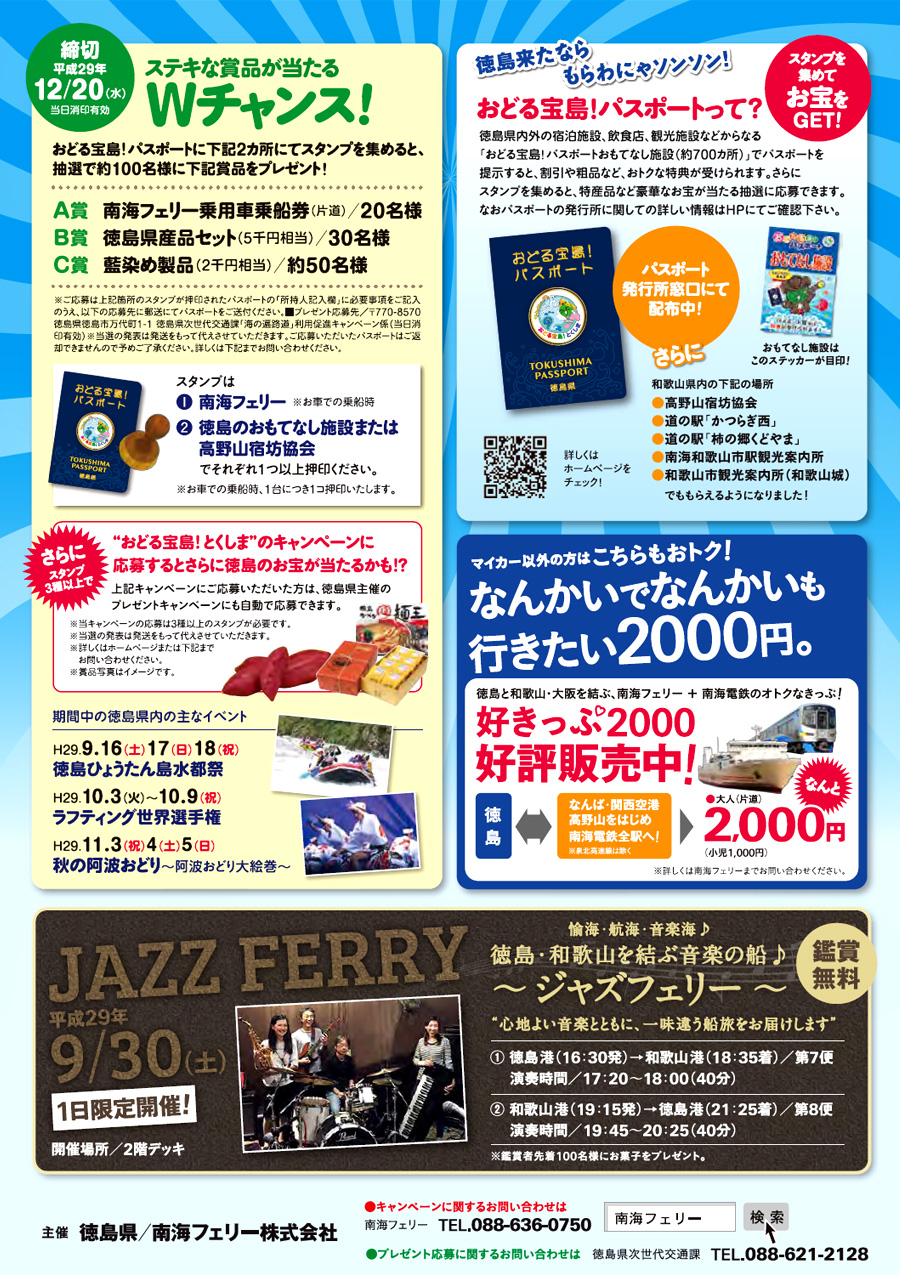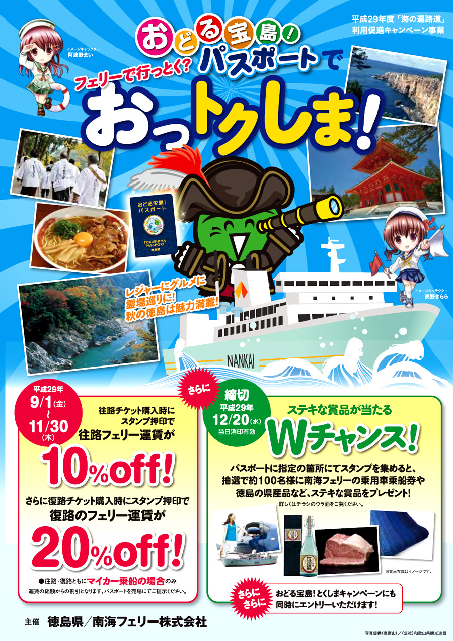 徳島県 おどる宝島!パスポートを持って、南海フェリー に マイカー乗船した方に、